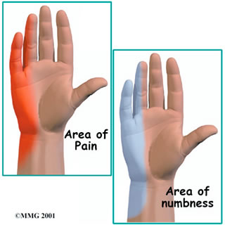 Numbness on the inside of the hand and in the ring and little fingers is an early sign of cubital tunnel syndrome. The numbness may develop into pain. The numbness is often felt when the elbows are bent for long periods, such as when talking on the phone or while sleeping. The hand and thumb may also become clumsy as the muscles become affected. Tapping or bumping the nerve in the cubital tunnel will cause an electric shock sensation down to the little finger. This is called Tinel's sign.