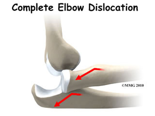 When the joint surfaces of an elbow are forced apart, the elbow is dislocated. The elbow is the second most commonly dislocated joint in adults. Elbow dislocations can be complete or partial. A partial dislocation is referred to as a subluxation. The amount of force needed to cause an elbow dislocation is enough to cause a bone fracture at the same time. These two injuries (dislocation and fracture) often occur together.