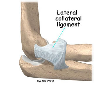In the elbow, two of the most important ligaments are the medial collateral ligament and the lateral collateral ligament. The medial collateral is on the inside edge of the elbow, and the lateral collateral is on the outside edge. Together these two ligaments connect the humerus to the ulna and keep it tightly in place as it slides through the groove at the end of the humerus. These ligaments are the main source of stability for the elbow. They can be torn when there is an injury to or dislocation of the elbow. If they do not heal correctly the elbow can be too loose, or unstable.