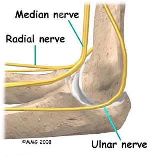 If a bone fracture is also involved the fracture can cut or damage a nerve causing temporary or permanent paralysis. Pain and an inability to straighten the elbow or pain when turning the hand the palm up (supination) is typical. There is often tenderness along the lateral aspect of the elbow (side of the elbow away from the body).