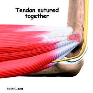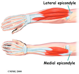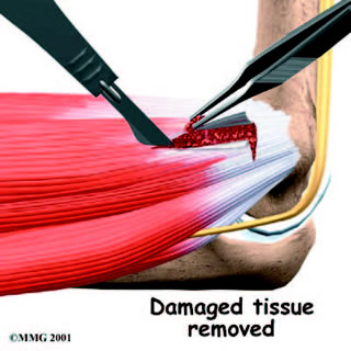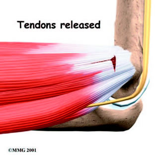 Sometimes nonsurgical treatment fails to stop the pain or help patients regain use of the elbow. In these cases, surgery may be necessary. A commonly used surgery for golfer's elbow is called a medial epicondyle release. This surgery takes tension off the flexor tendon. The surgeon begins by making an incision along the arm over the medial epicondyle. Soft tissues are gently moved aside so the surgeon can see the point where the flexor tendon attaches to the medial epicondyle. The flexor tendon is then cut where it connects to the medial epicondyle. The surgeon splits the tendon and takes out any extra scar tissue. Any bone spurs found on the medial epicondyle are removed.