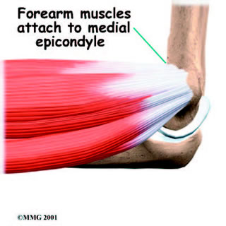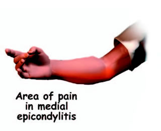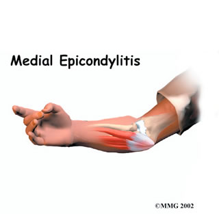 Medial epicondylitis is commonly known as golfer's elbow. This does not mean that only golfers have this condition. Many other repetitive activities can also lead to golfer's elbow: throwing, chopping wood with an ax, running a chain saw, and using many types of hand tools. It is pain that is caused by overuse of the tendons that attach to the part of the elbow called the medial epicondyle.