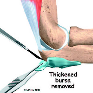 Surgery is sometimes necessary to remove a thickened bursa that has not improved with any other treatment. Surgical removal is usually done because the swollen bursa is restricting your activity. To remove the olecranon bursa, an incision is made over the tip of the elbow. Since the bursa is outside of the elbow joint, the joint is never entered. The thickened bursa sac is removed, and the skin is repaired with stitches. Your elbow may be placed in a splint to rest the elbow and prevent it from moving for a few days. This allows the wound to begin to heal and prevents bleeding into the area where the bursa was removed. Some types of bursae will grow back after surgery, because the skin needs to slide over the olecranon smoothly. The body forms another bursa as a response to the movement of the olecranon against the skin during the healing phase. If all goes well, the bursa that returns after surgery will not be thick and painful, but more like a normal bursa.