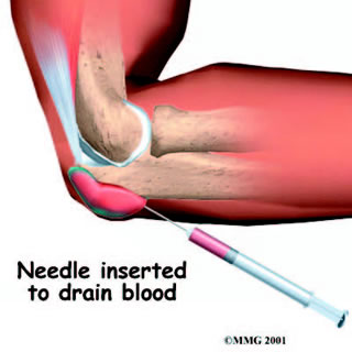 Olecranon bursitis that is caused by an injury will usually go away on its own. The body will absorb the blood in the bursa over several weeks, and the bursa should return to normal. If swelling in the bursa is causing a slow recovery, a needle may be inserted to drain the blood and speed up the process. There is a slight risk of infection in putting a needle into the bursa.