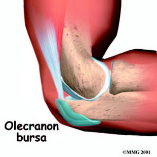 A bursa is a sac made of thin, slippery tissue. Bursae occur in the body wherever skin, muscles, or tendons need to slide over bone. Bursae are lubricated with a small amount of fluid inside that helps reduce friction from the sliding parts. The olecranon bursa is located between the tip, or point, of the elbow (called the olecranon) and the overlying skin. This bursa allows the elbow to bend and straighten freely underneath the skin.