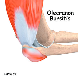 Olecranon bursitis causes pain and swelling in the area at the tip of the elbow. It may be very difficult to put the elbow down on a surface due to the tenderness. If the condition has been present for some time, small lumps may be felt underneath the skin over the olecranon. Sometimes these lumps feel as though something is floating around in the olecranon bursa, and they can be very tender. These lumps are usually the thickened folds of bursa tissue that have formed in response to chronic inflammation. The bursa sac may swell and fill with fluid at times. This is usually related to your activity level, and more activity usually causes more swelling.