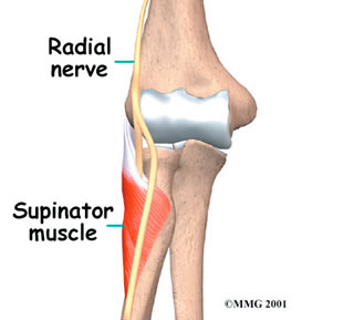 Passing through the radial tunnel, the radial nerve runs below the supinator muscle. The supinator muscle lets you twist your right hand clockwise. This is the motion of using a screwdriver to tighten a screw. After the radial nerve passes under the supinator muscle, it branches out and attaches to the muscles on the back of the forearm.
