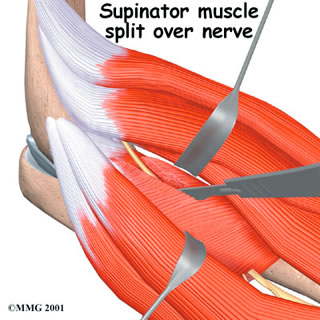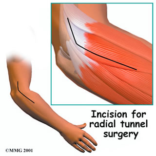 Sometimes symptoms of radial tunnel syndrome aren't relieved, even after many months of nonsurgical treatment. In these cases, surgery may be the best treatment option. It is generally considered a last resort. The goal of surgery for radial tunnel syndrome is to relieve any abnormal pressure on the nerve where it passes through the radial tunnel. The surgeon begins by making an incision along the outside of the elbow and down the forearm, near the spot where the radial nerve goes under the supinator muscle. Soft tissues are gently moved aside so the surgeon can check the places where the radial nerve may be getting squeezed within the radial tunnel. The nerve can be pinched in many spots, so it is important to check all the areas that may be causing problems. Any parts of the tunnel that are pinching the nerve are cut. This expands the tunnel and relieves pressure on the nerve. At the end of the procedure, the skin is stitched together.