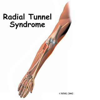 Radial tunnel syndrome happens when the radial nerve is squeezed where it passes through a tunnel near the elbow.