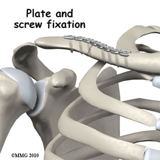 Some clavicle fractures may need surgery. If your surgeon makes the assessment that the fracture will not heal and give you good shoulder function without surgery, surgical treatment will be recommended. Surgical treatment of clavicle fractures is usually performed with a metal plate and screws along the side of the bone. Open Reduction and Internal Fixation (ORIF) of clavicle fractures using a metal plate and screws is common. This type of treatment allows the fracture fragments to be restored as close to their normal position as possible and held there until healing occurs.