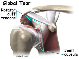 The rotator cuff is a unique structure in the shoulder that is formed by four tendons. These four tendons attach to four muscles that help keep the shoulder stabilized in the socket (or glenoid) and help rotate the upper arm inward and outward. If the rotator cuff is torn and is not repaired, a type of wear and tear arthritis of the shoulder can develop over time. This condition is sometimes called arthropathy and the term cuff tear arthropathy is used to describe this type of arthritis of the shoulder that develops when the rotator cuff is damaged.