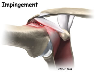 The rotator cuff slides between the humeral head and the acromion as we raise our arm. As this sliding occurs over and over, the rotator cuff tendons will often be pinched as you use the shoulder everyday. This pinching is called impingement. Over time this pinching can lead to damage and weakening of the rotator cuff tendons.