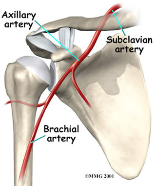 Traveling along with the nerves are the large vessels that supply the arm with blood. The large axillary artery travels through the axilla. If you place your hand in your armpit, you may be able to feel the pulsing of this large artery. The axillary artery has many smaller branches that supply blood to different parts of the shoulder. The shoulder has a very rich blood supply.