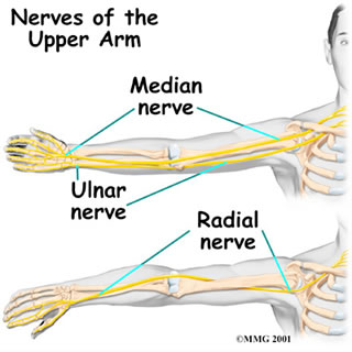 The main nerves that travel into the arm run through the axilla (armpit area) under the shoulder. Three main nerves begin together at the shoulder: theradial nerve, the ulnar nerve, and the median nerve. These nerves carry the signals from the brain to the muscles that move the arm. The nerves also carry signals back to the brain about sensations such as touch, pain, and temperature. There is also an important nerve that travels around the back of the shoulder joint to supply sensation to a small area of skin on the outside of the shoulder and motor signals to the deltoid muscle. This nerve is called the axillary nerve.