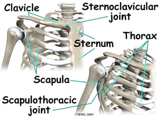 A false joint is formed where the shoulder blade glides against thethorax (the rib cage). This joint, called the scapulothoracic joint, is important because it requires that the muscles surrounding the shoulder blade work together to keep the socket lined up during shoulder movements.