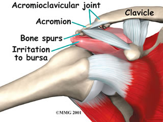 Usually, there is enough room between the acromion and the rotator cuff so that the tendons slide easily underneath the acromion as the arm is raised. But each time you raise your arm, there is a bit of rubbing or pinching on the tendons and the bursa. This rubbing or pinching action is called impingement. Impingement occurs to some degree in everyone's shoulder. Day-to-day activities that involve using the arm above shoulder level cause some impingement. Usually it doesn't lead to any prolonged pain. But continuously working with the arms raised overhead, repeated throwing activities, or other repetitive actions of the shoulder can cause impingement to become a problem. Impingement becomes a problem when it causes irritation or damage to the rotator cuff tendons. Raising the arm tends to force the humerus against the edge of the acromion. With overuse, this can cause irritation and swelling of the bursa. If any other condition decreases the amount of space between the acromion and the rotator cuff tendons, the impingement may get worse. For example, bone spurs can reduce the space available for the bursa and tendons to move under the acromion.