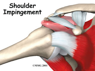 In the early stages impingement syndrome causes a generalized shoulder and pain when raising the arm out to the side or in front of the body. Most patients complain that the pain makes it difficult for them to sleep, especially when they roll onto the affected shoulder. As the condition worsens, the discomfort increases. Sometimes a catching sensation is felt when you lower your arm. Weakness and inability to raise the arm may indicate that the rotator cuff tendons are actually torn.