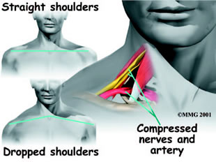 People with TOS often slouch their shoulders, giving them a drooped appearance. The poor body alignment of slouching can compress the nerves and arteries near the thoracic outlet. Being overweight can cause problems with posture, and women who have very large breasts may also have a droopy posture. For some reason, TOS affects three times as many women as men.