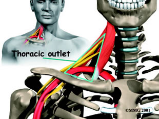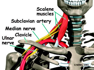 The nerves and blood vessels that go into the arm and hand start at the side of the neck. Nerves come out of the spine through small openings along the side of each vertebra. These openings are called neural foramina. The nerves and vessels travel between muscles in the neck called the scalene muscles and over the top of the rib cage. The thoracic outlet is this opening between the scalene muscles and the rib cage. The nerves and blood vessels then go under the collarbone (also known as the clavicle), through the armpit (the axilla), and down the arm to the hand.
