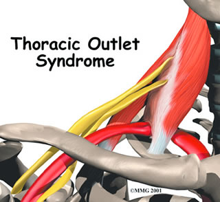The main cause of TOS is that the nerves and blood vessels going to the arm and hand get squeezed near the thoracic outlet. This can occur for many reasons. Pressure on nerves and vessels can happen in people who have fractured their clavicle. It can also happen in people who have an extra first rib, although this doesn't always result in TOS. Extra muscle or scar tissues in the scalene muscles can put extra pressure on the nerves and arteries. Heavy lifting and carrying can bulk up the scalene muscles to the point where the nerve and arteries get squeezed. Neck and arm positions used at work and home may contribute to TOS. People who have to hold their neck and shoulders in awkward alignment sometimes develop TOS symptoms. TOS symptoms are also reported by people who have to hold their arms up or out for long periods of time.